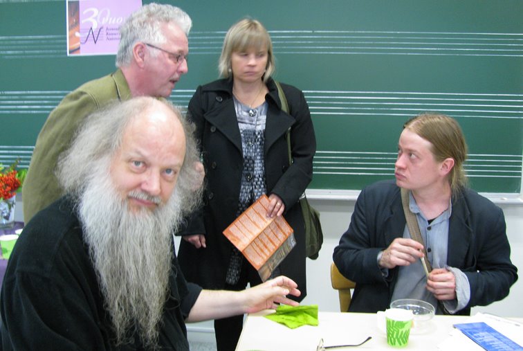 Kirjailija Kristina Carlson, tapahtuman järjestäjä Lisbet Svahn ja professori Kari Enqvist. Taustalla Reijo Kela.